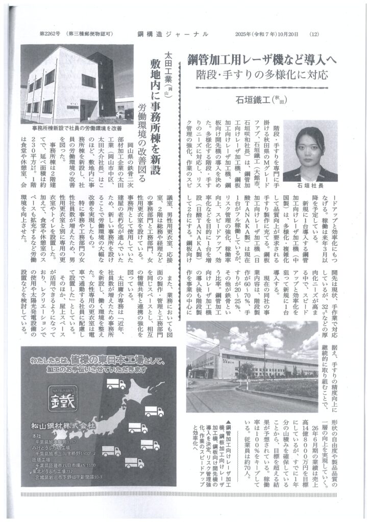 • 鋼構造ジャーナル 第2262号に紹介されました。